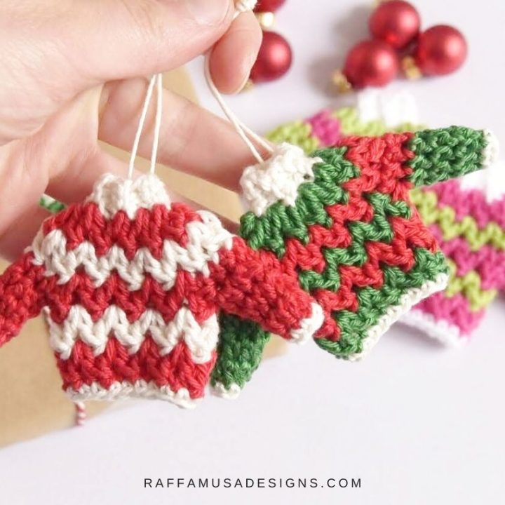 Give the gift of crochet ornament this year with this adorable "ugly" Christmas sweater ornaments.