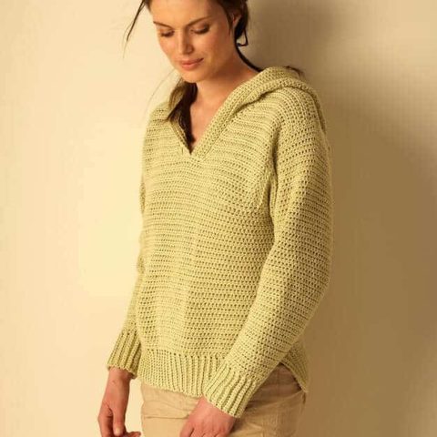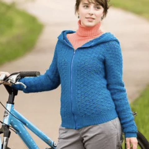 This zip front hoodie has a lacy fan stitch to make a beautiful cardigan. Due to the waist and sleeve shaping, this is considered an intermediate pattern.