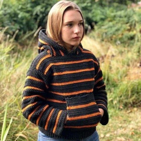 This hoodie is designed with two basic crochet stitches and is considered an easy pattern, which means it is perfect for beginner crocheters!