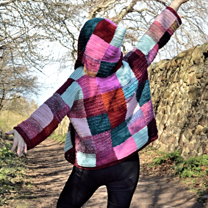 I put this hoodie into the intermediate section because of the squares that will need to be stitched together. Once joined, they create a gorgeous patchwork crochet hoodie.