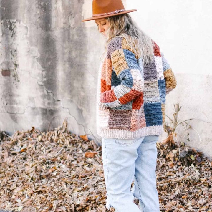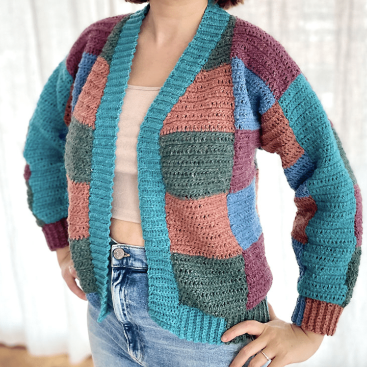 This easy cardigan pattern is written for sizes XS – 5XL and includes a video tutorial too! While this cardigan isn't made up of squares, the stripes give the illusion of a patchwork cardi.