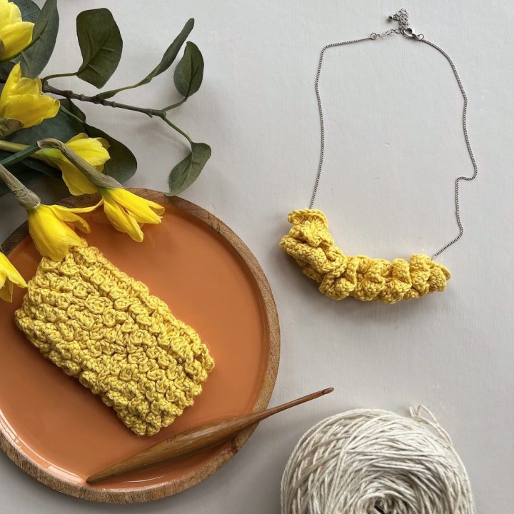 Make a crocheted necklace using a ruffled stitch which creates a fun modern design for outfits.