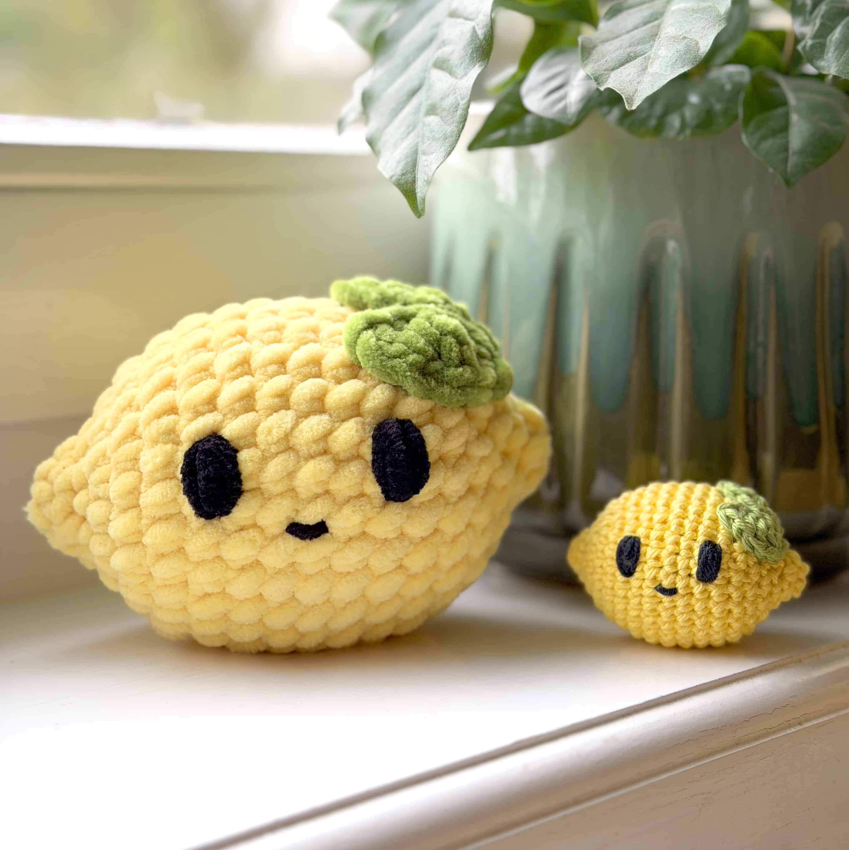 Crochet a cute mini lemon with this free lemon crochet pattern for beginners, including full video to help you with every step. Use cotton yarn to make a lemon keychain or thicker plush yarn to create a bigger plushie lemon. The pattern is suitable for any yarn. There are many more food patterns on the DIY Fluffies blog.